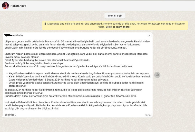 “Merhaba, biliyorsun geçen Aralık ortalarında Mamoste’nin 50. sanat yılı vesilesiyle belli başlı sanatçılardan bu çerçevede kısa bir video mesajı talep etttigimizi ve bu anlamda Aynur’dan da bekledigimizi sana telefonda söylemiştim. Sen Aynur’la konuşup bugün, yarın gibi kısa bir süre içinde döneceğini söylemiştin ama bugüne kadar da bir dönüşünüz olmadı.