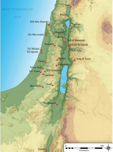 Sekizinci yüzyıl ortası depremiyle ilgili sismik hasar olduğu düşünülen alanlar (Harita: George A. Pierce, Kaliforniya Üniversitesi, Los Angeles). Tevrat arkeolojisi kapsamında kazısı yapılan ve deprem izine rastlandığı iddia edilen bir diğer kent de Yeruşalim yerleşmesidir. MÖ 586 öncesi bir tahribat tabakasının kalıntıları ve daha çok MÖ 8’nci yüzyılın ortalarında meydana gelen bir depremin neden olduğu bölgesel bir yıkımın varlığı öne sürülür. Burada, bir yapıdaki odada üzerlerine düşmüş taşların bulunduğu bir dizi parçalanmış çanak çömlek ortaya çıkarıldı. Bir domuz iskeletinin dikey konumda ve bütün olarak bulunması bu döküntü taş ve parçalanmış çanak çömlekle birleştirilince, bu tahribatın bir deprem sonucunda oluştuğu fikrine varıldı.