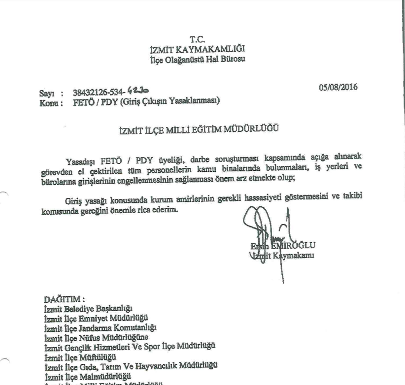Açığa alınan kişilerin kamu binalarına girişlerinin engellenmesinin kabul edilemez olduğunu kaydeden Gergerlioğlu, “Kişinin hakkında kesinleşmiş bir hüküm yok idari ve adli olarak. Açığa alınmış ve ‘hiçbir kamu binasına, işyerine, büroya giremez’ diyor. Kim demiş bunu? Ersin Emiroğlu, İzmit Kaymakamı şu anda Sakarya Vali Yardımcısı. Utanç verici bu kararın altına imza atıp ‘Gizli’ ibaresi ile nerelere göndermiş? İzmit Belediye Başkanlığı, İzmit İlçe Emniyet Müdürlüğü, İzmit İlçe Jandarma Komutanlığı, İzmir İlçe Nüfus Müdürlüğü, İzmit Gençlik Hizmetleri ve Spor İlçe Müdürlüğü, İzmit İlçe Müftülüğü, İzmit İlçe Gıda, Tarım ve Hayvancılık Müdürlüğü, İzmit İlçe Mal Müdürlüğü, İzmit İlçe Milli Eğitim Müdürlüğü, İzmit İlçe Sağlık Müdürlüğü, İzmit İlçe Sosyal Yardımlaşma ve Dayanışma Vakfı, İzmit Tapu Müdürlüğü, İzmit Toplum Sağlığı Merkezi, İzmit Sosyal Hizmet Merkezi Müdürlüğü” diye konuştu.
