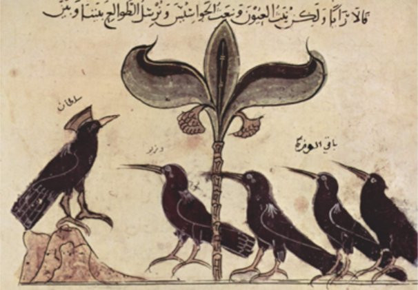 Dimne ve Kral Aslan arasında konuşma, Kelile ve Dimne Yazması 1429 tarihli Herat-İran’da hazırlanmış nüsha. Topkapı Sarayı Müzesi. Baykuş ve kargalarla ilgili olan bir başka hikayede iyi gözlem yaparak değerlendirme yapmanın önemini anlatılır. Konu ile ilgili minyatürlerde Kral Karga’nın baykuşlara karşı mücadele etmenin ve korunmanın yollarını tespit etmek için dört vezir kargasıyla yaptığı toplantı resmedilmiştir. Resimde hiyerarşi hemen dikkati çeker. Kral karga daha yüksek bir yerden toplantıyı yönetir.